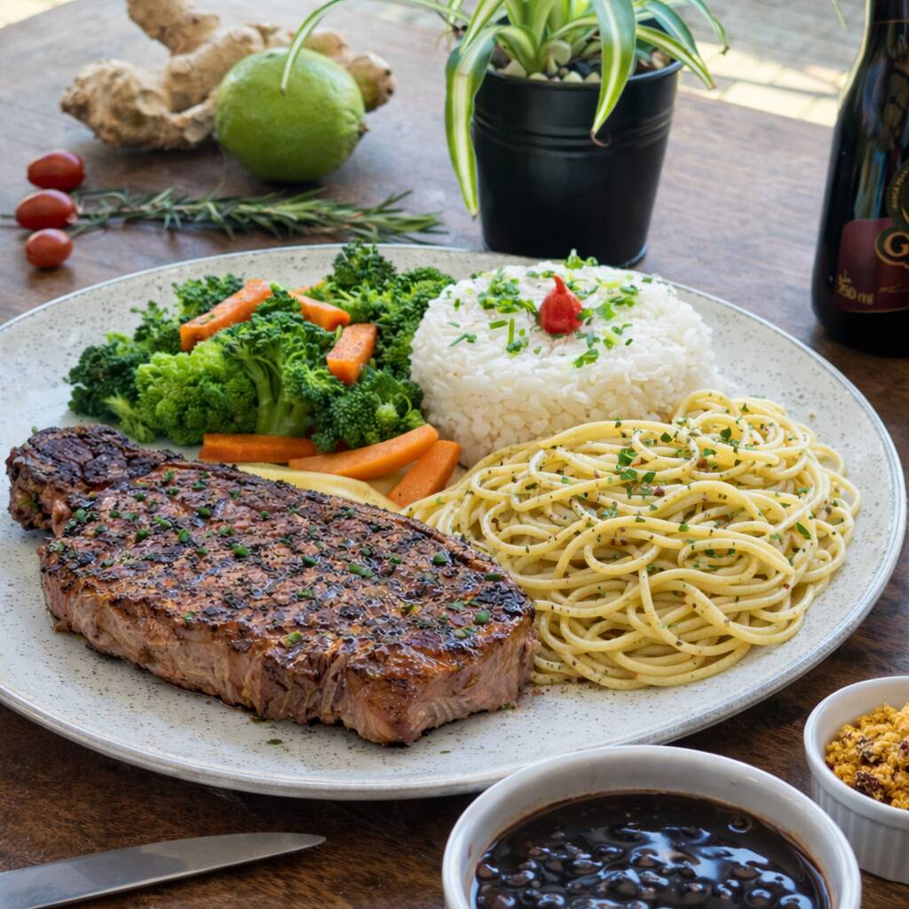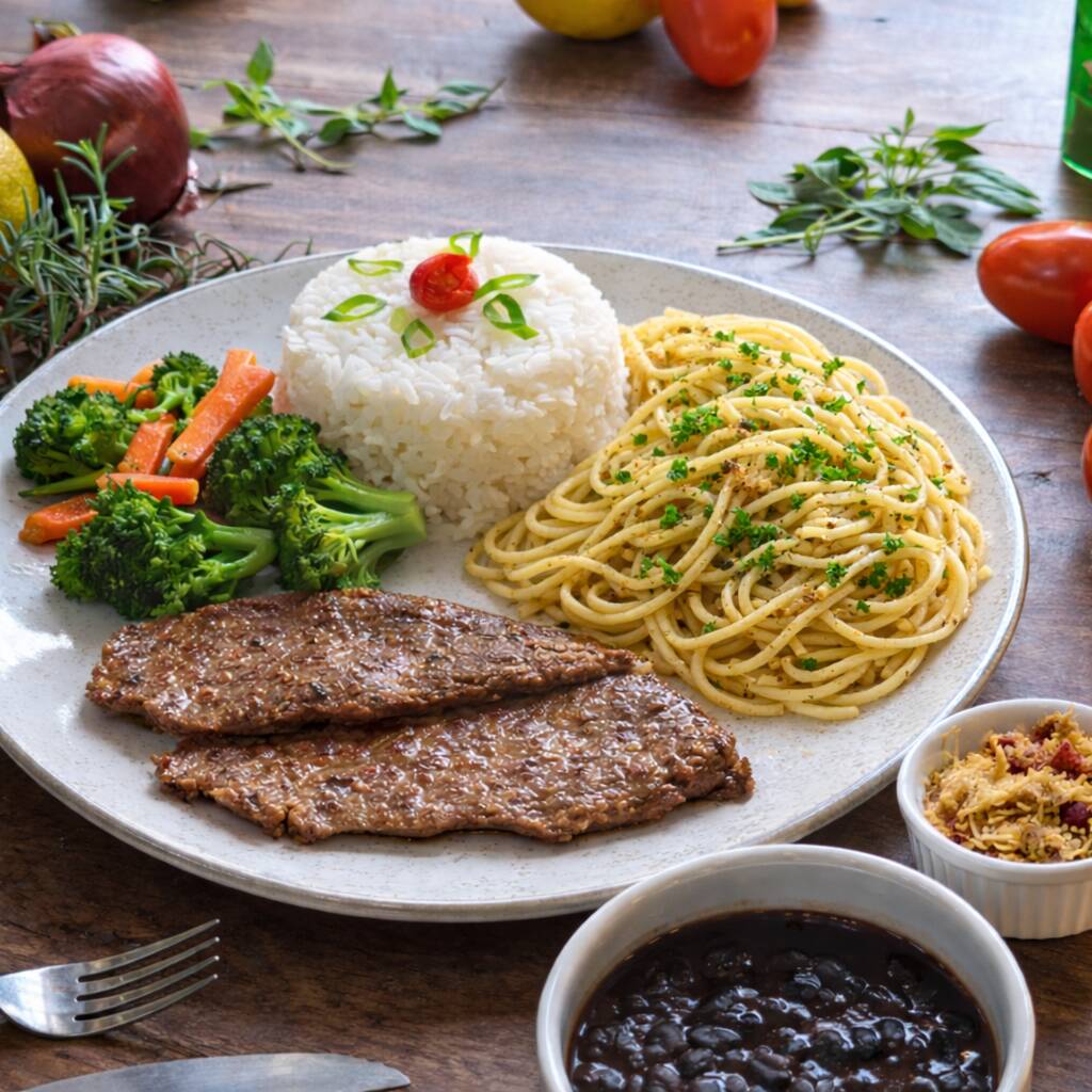 Contra-filé sem osso com arroz, feijão, espaguete alho e óleo, farofa e legumes na manteiga.