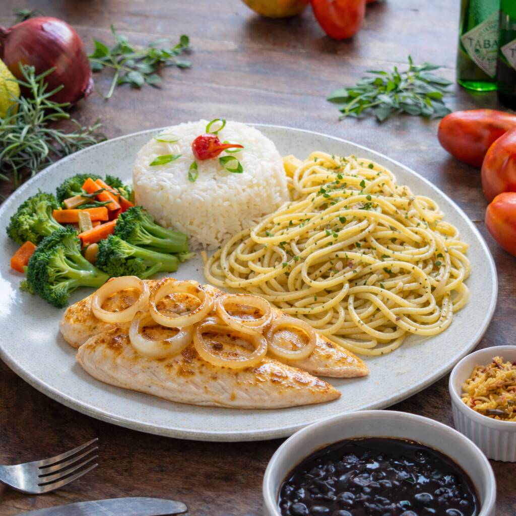 Peito de frango acebolado grelhado com arroz, feijão, espaguete alho e óleo, farofa e legumes na manteiga.