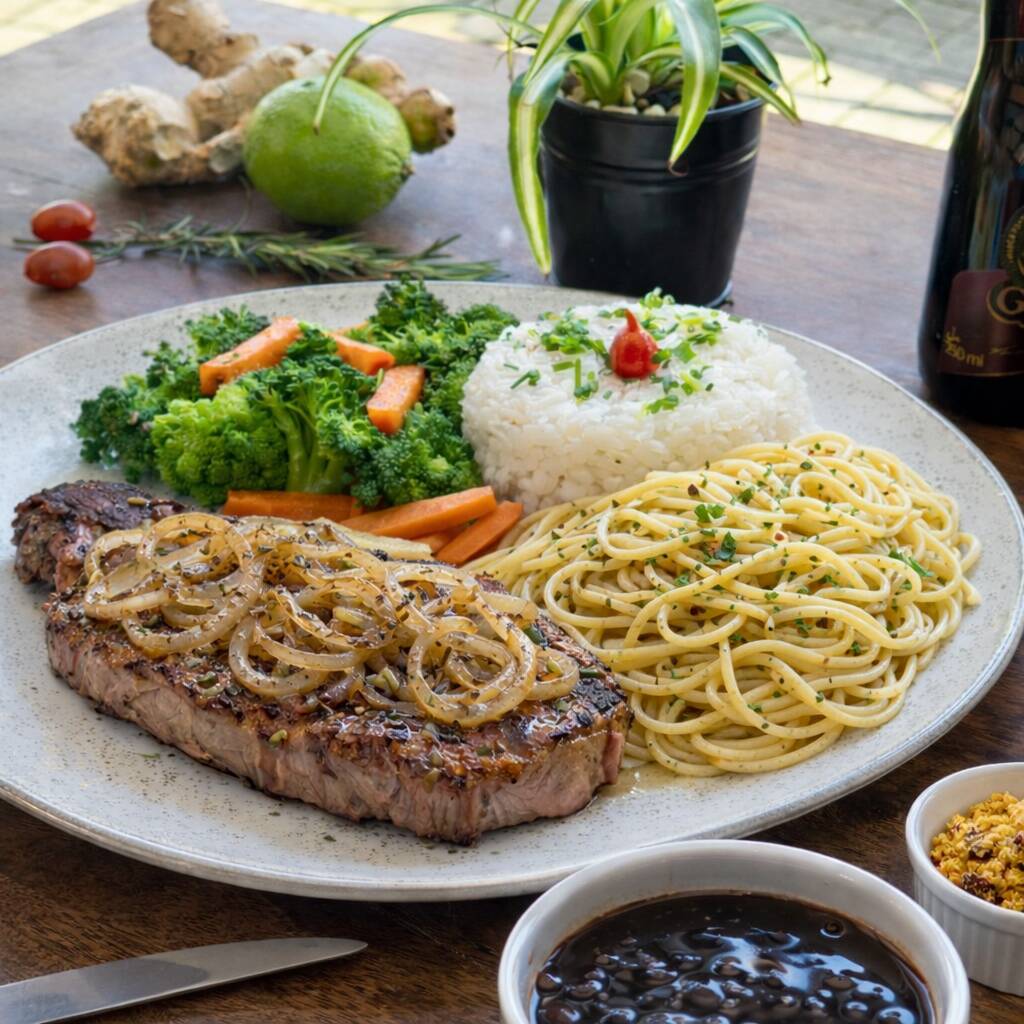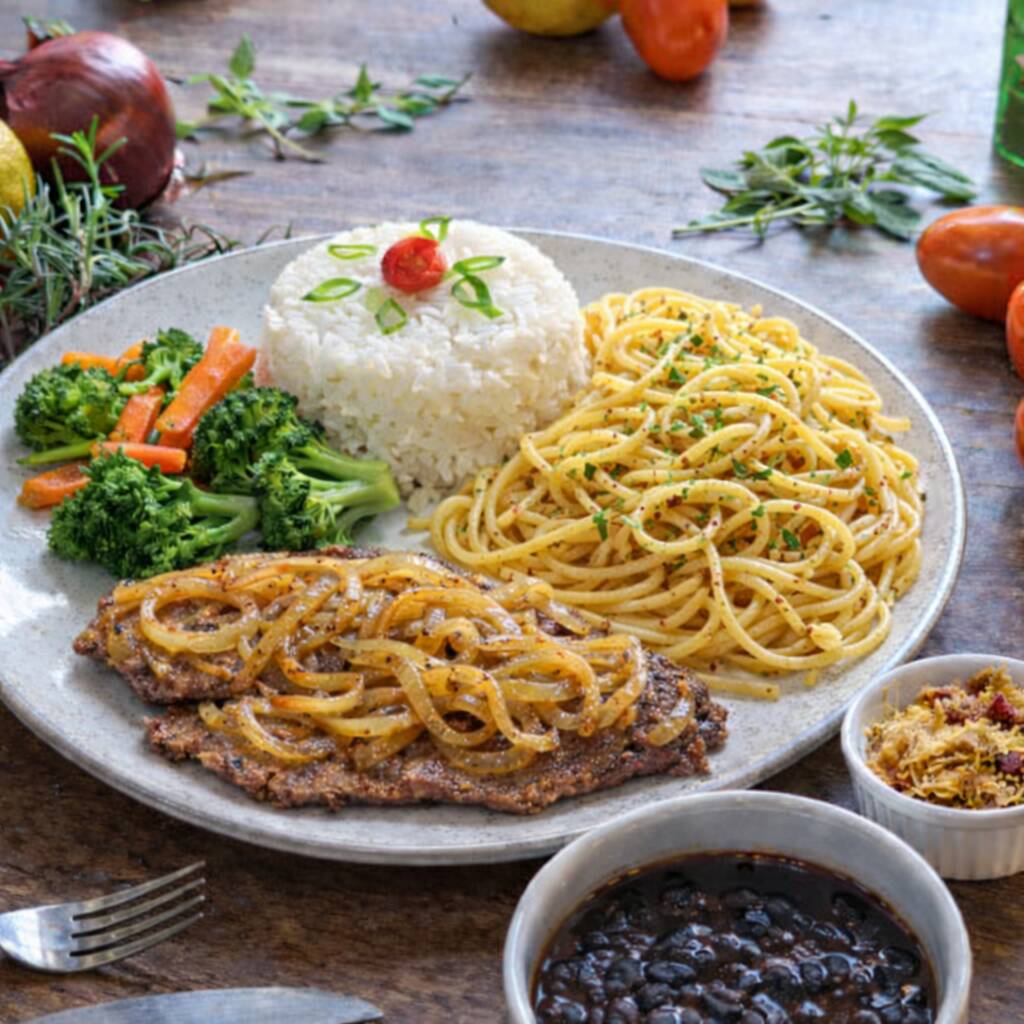 Contra-filé acebolado com arroz, feijão, espaguete alho e óleo, farofa e legumes na manteiga.