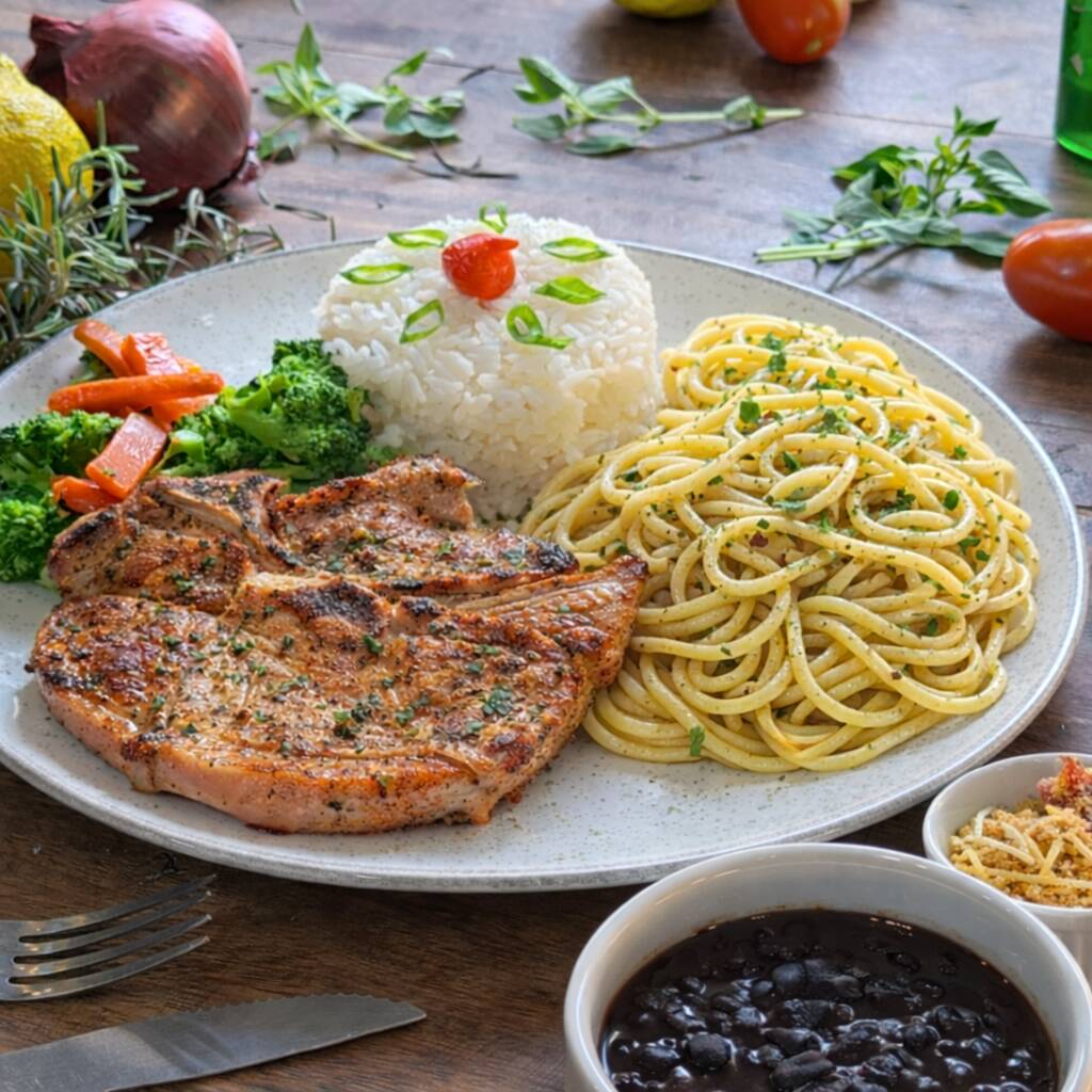 Bisteca suína com arroz, feijão, espaguete alho e óleo, farofa e legumes na manteiga.