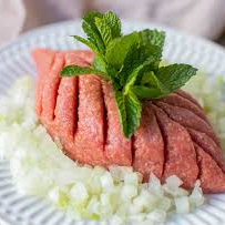 Torre de Kibe Cru - Intercalado, tabule, carne refogada com nozes e amêndoas coberto com pasta e cebola crocante