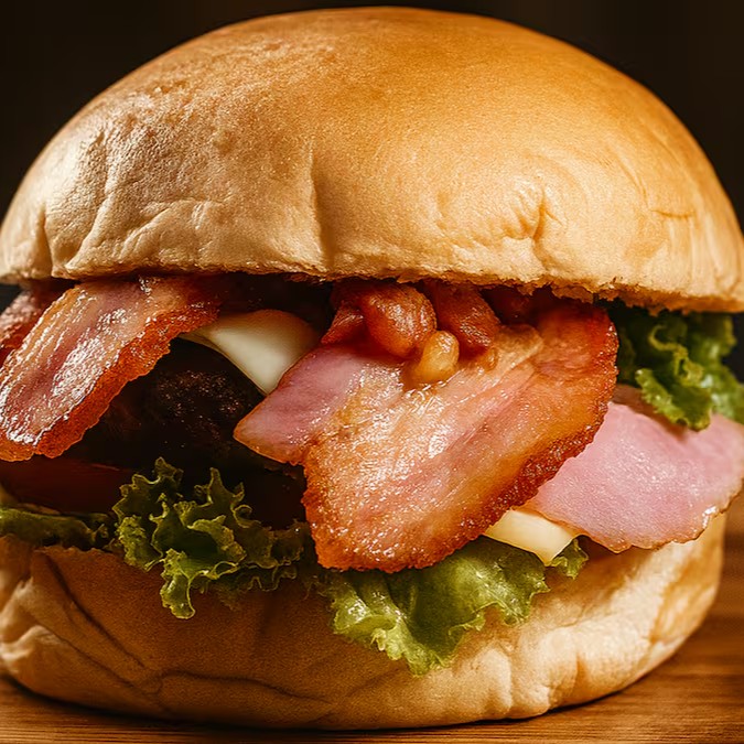 Pão , Hambúrguer Tradicional , queijo, presunto, Bacon, alface e tomate, molho bily Jack