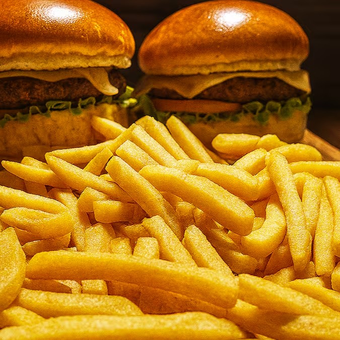 Batatas fritas crocantes, o acompanhamento perfeito para completar esta refeição deliciosa.