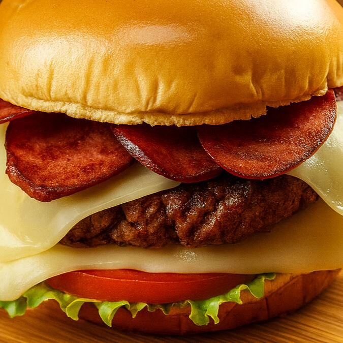 Pão com gergelim selado na manteiga, hamburguer tradicional de 56 gramas, Bacon crocante,queijo Mussarela, maionese artesanal, alface e tomate.