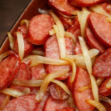 Porção de calabresa acebolada, uma explosão de sabores defumados e picantes.