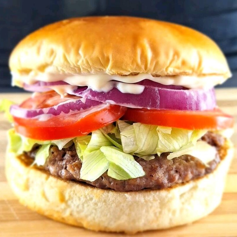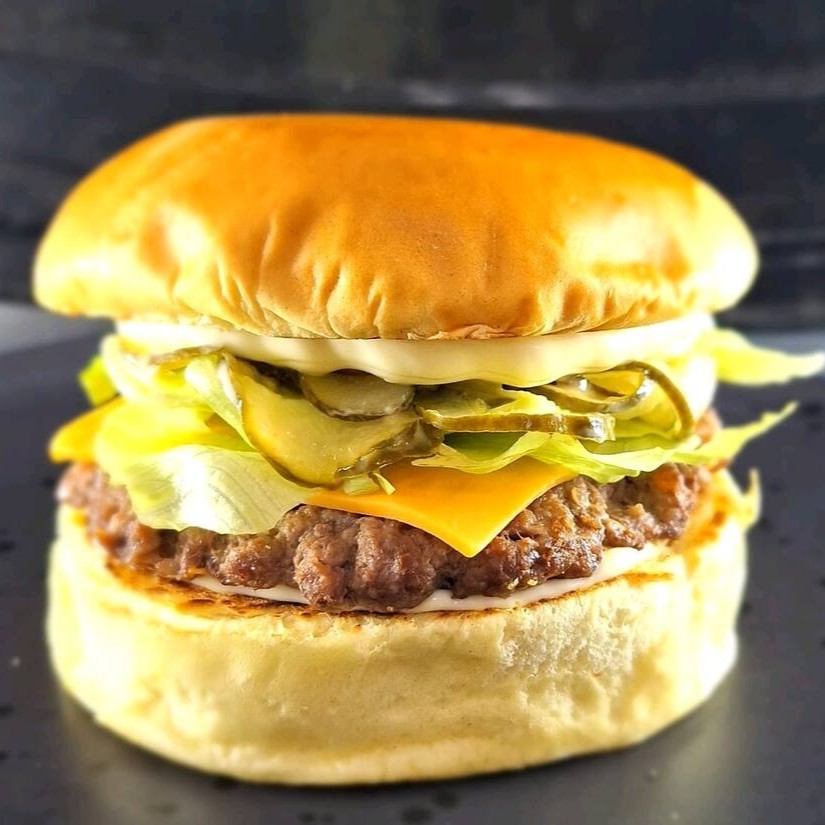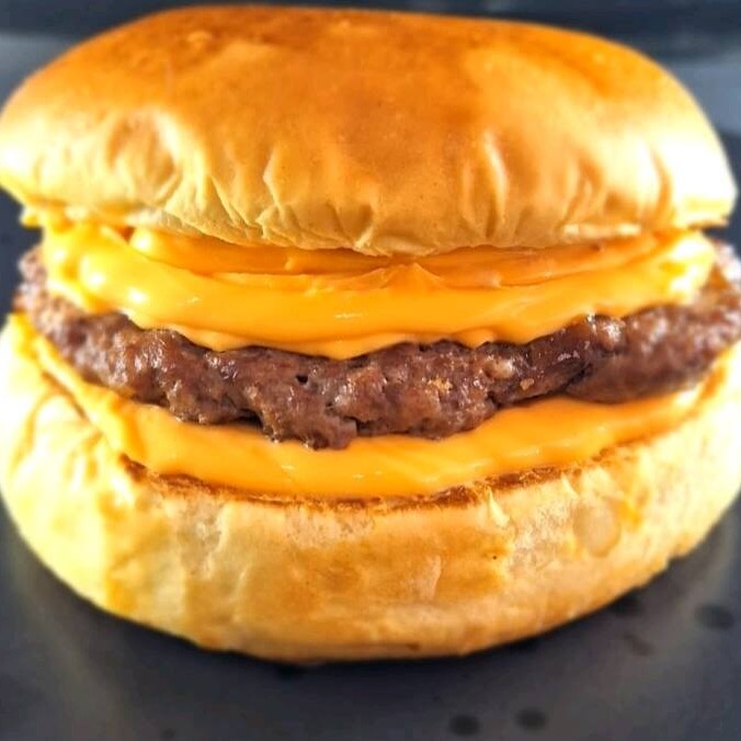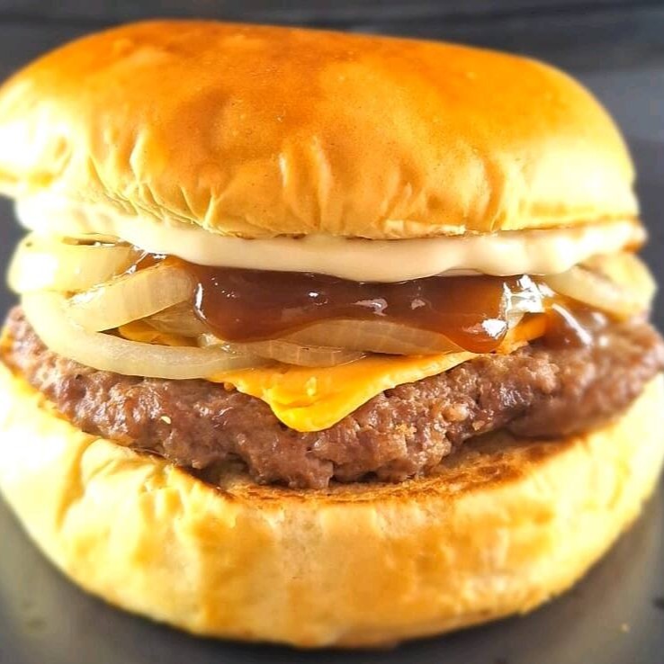 Hambúrguer artesanal feito na Brasa, Pão brioche selado na manteiga, queijo cheddar, e cebola ao shoyu.