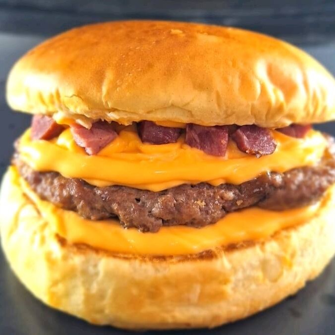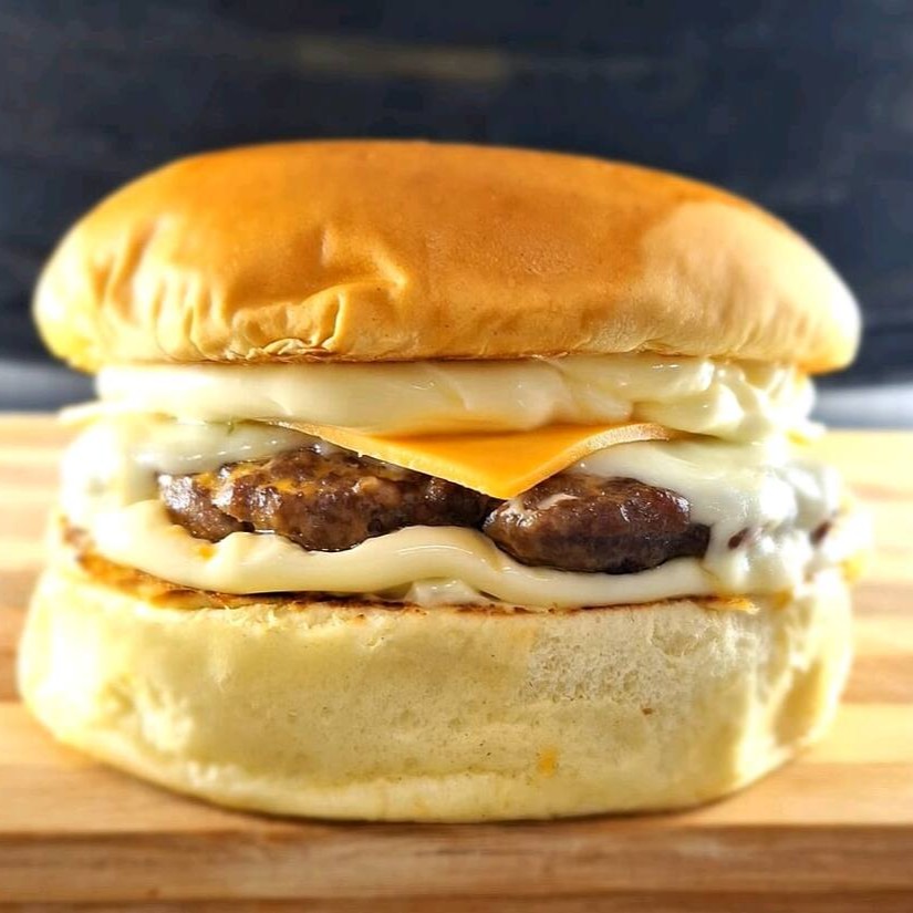 Hambúrguer artesanal feito na Brasa, Pão brioche selado na manteiga, molho de maionese Acompanhado de dois queijos cheddar e mussarela.