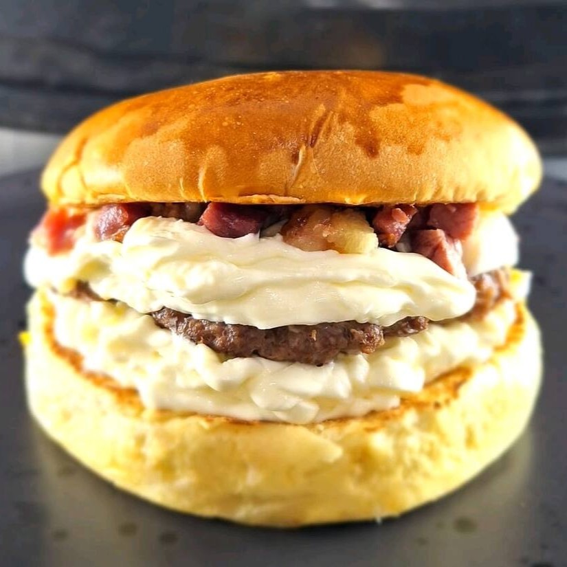 Hambúrguer artesanal feito na Brasa, Pão brioche selado na manteiga acompanhado de molho catupiry, e cubos de bacon