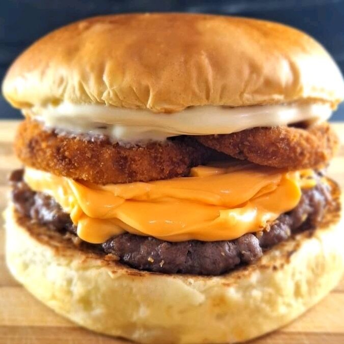 Hambúrguer feito na Brasa, Pão brioche selado na manteiga a base de maionese, anel de cebola, e molho cheddar.