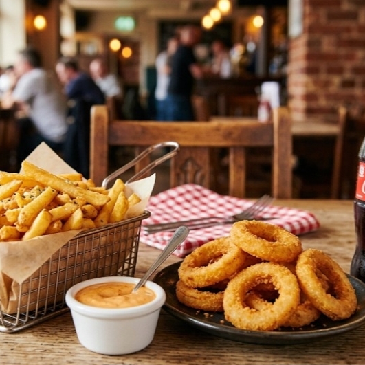 150g de batata frita, 5 unidades de anel de cebola, acompanhado de um molho, coca cola 200ml