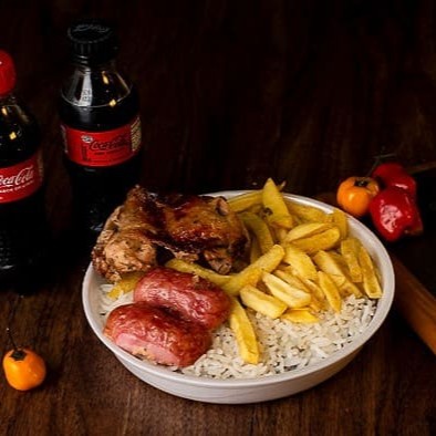 Feijão, Arroz, Batata frita, Frango + Linguiça **Informações importantes:** - Não realizamos substituições nas carnes. - Os itens da marmita são enviados juntos. - A base da nossa marmita é composta por arroz e feijão, não sendo possível removê-los. Imagens meramente ilustrativas.