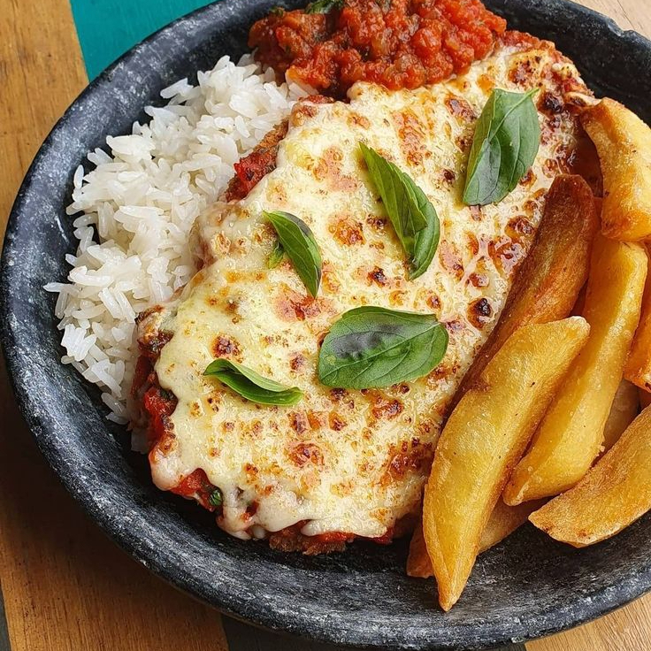 Suculento bife à parmegiana com molho de tomate fresco e queijo mussarela derretido, acompanhado de arroz e batata rústica.