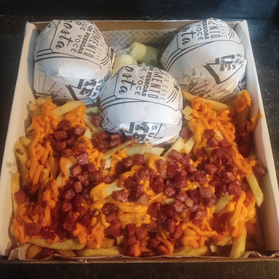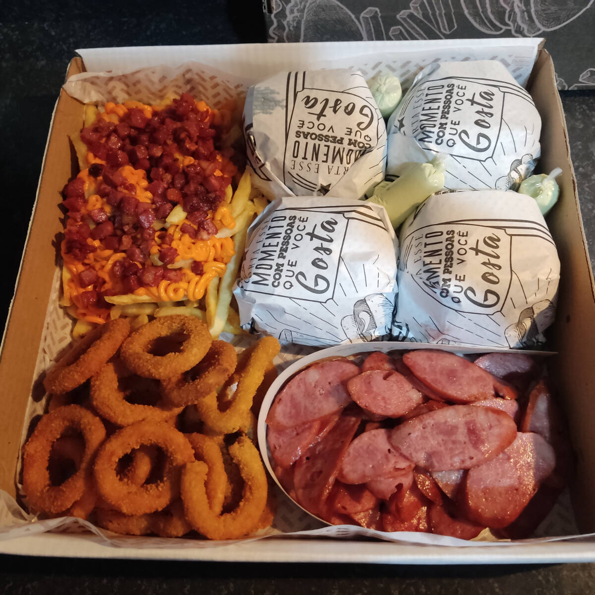 4 hambúrguer artesanal, Pão brioche, queijo mussarela, calabresa, cheddar e maionese especial. Acompanham 3 porções sendo possível escolher entre (batata frita tradicional, batata com bacon e cheddar, calabresa, onion rings e polenta palito). Ver menos