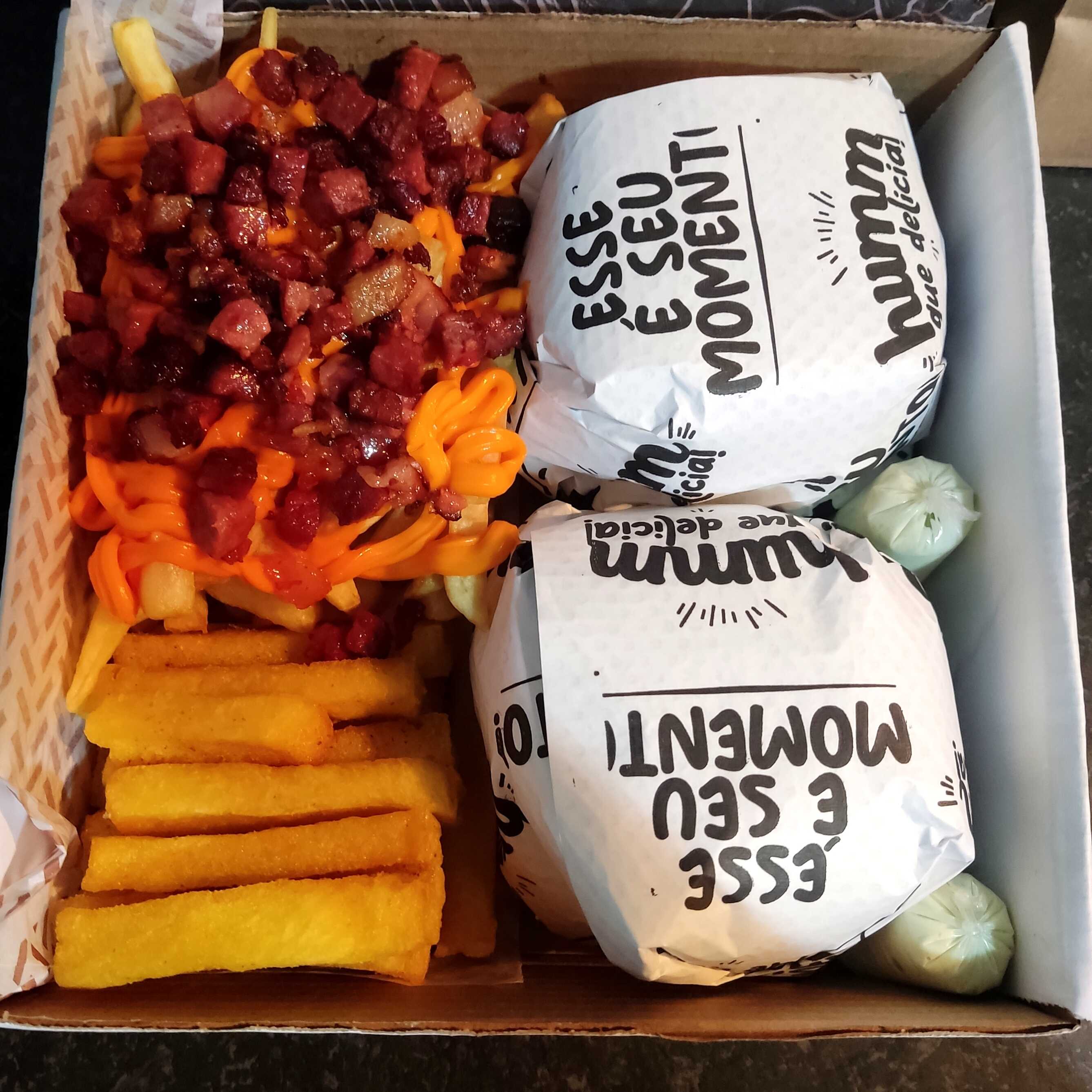 2 hambúrguer artesanal, no pão Brioche, bacon, cheddar e maionese especial. Acompanham duas porções a sua escolha (batata frita tradicional, batata frita com cheddar e bacon, calabresa, onion rings ou polenta palito).