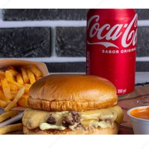 Pão brioche, hambúrguer artesanal, queijo mussarela, tomate e alface americana. Acompanha batata com cheddar e bacon e um refrigerante lata 350ml da sua escolha.