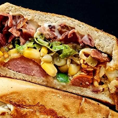 2 Hambúrguer Bovino Artesanal, acompanhado de Queijo Mussarela, Presunto, Salsicha grelhada, Milho, Alface e Tomates Frescos, Ovo, Batata palha, Ketchup, Mostarda e bastante Maionese Caseira. Servido no Pão prensado de 18cm!!!