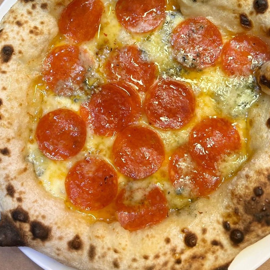 Pizza artesanal 25cm, com massa de longa fermentação, mussarela, gorgonzola, pepperoni e mel picante .