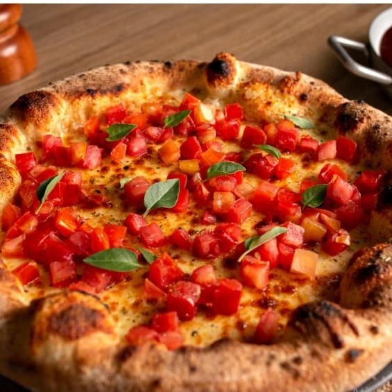 Molho de tomate, mussarela, tomate em cubos e manjericão fresco.