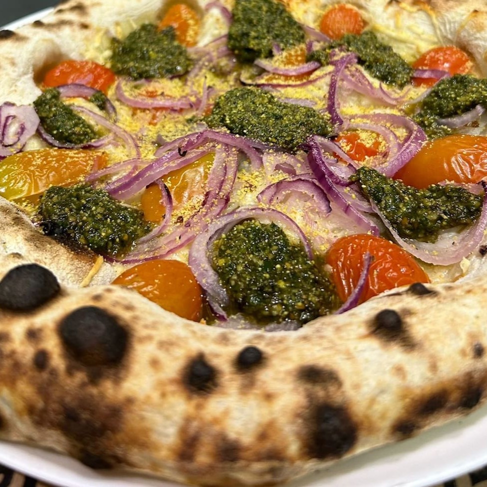 Pizza artesanal 25cm, com massa de longa fermentação, molho pesto, parmesão, cebola roxa, tomate cereja e pistache em pó .