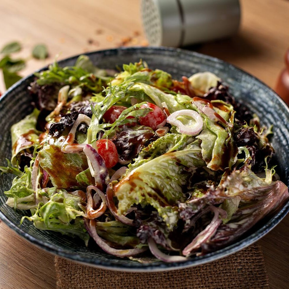 Mix de folhas, tomates cereja, molho caesar e cebola crispy .
