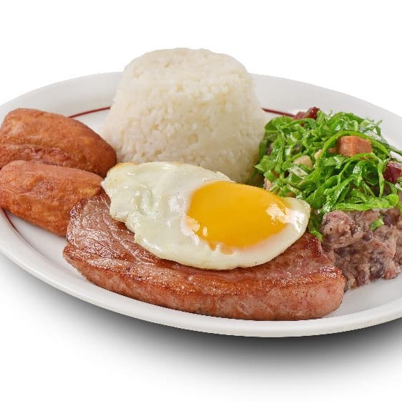 Grelhado + Tutú de feijão + Couve com bacon + Banana a milanesa (ou fritas) + Ovo frito + Arroz. Embalado em marmita.