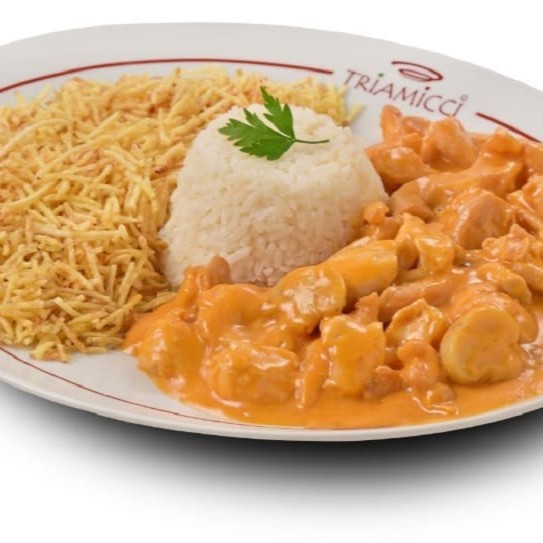 Strogonoff de frango + Batata palha (ou fritas ou purê) + Arroz. Peso do strogonoff = aprox. 250 gramas.