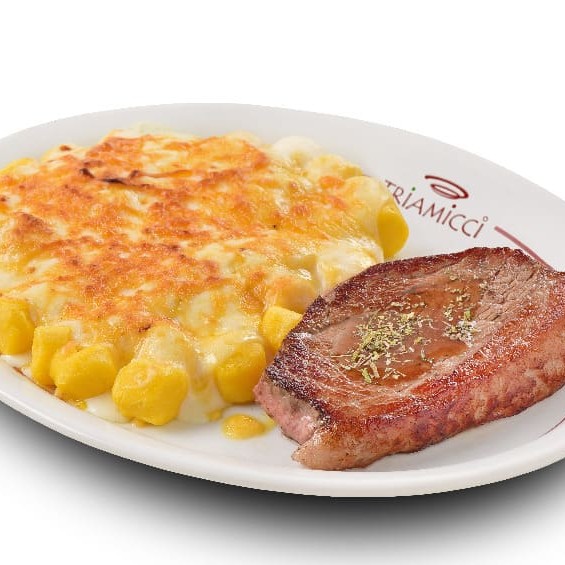 Delicioso filet à parmegiana (aprox 110g) sobre molho artesanal de tomates italianos, coberto por fettuccini ao molho quatro queijos gratinado com parmesão.