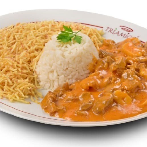 Strogonoff de carne + Batata palha (fritas ou purê) + Arroz. Peso do strogonoff = aprox. 250 gramas.