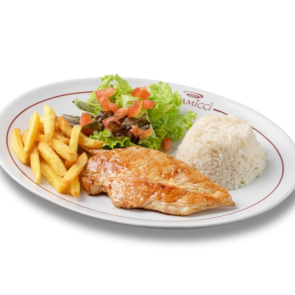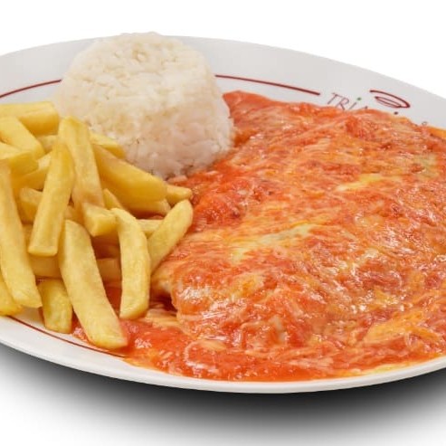 Delicioso filet à parmegiana (apróx. 110gr in natura) com molho artesanal de tomates italianos, gratinado com parmesão. Acompanha arroz e guarnição de sua preferência.