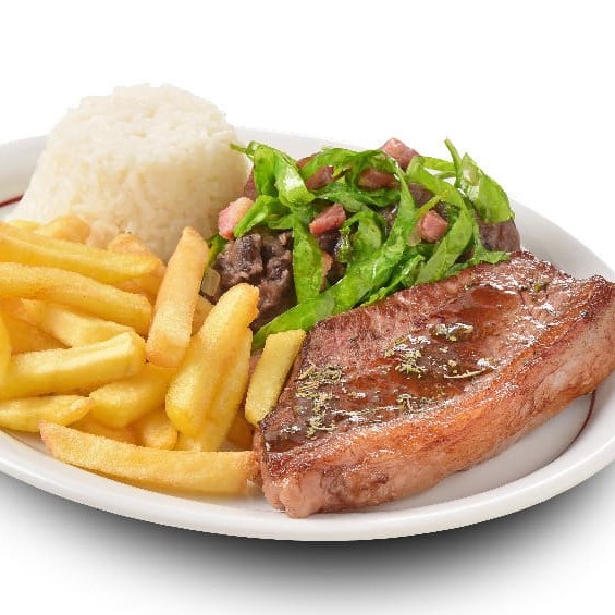 Grelhado + Tutú de feijão + Couve com bacon + Fritas + Arroz. Embalado em marmita.