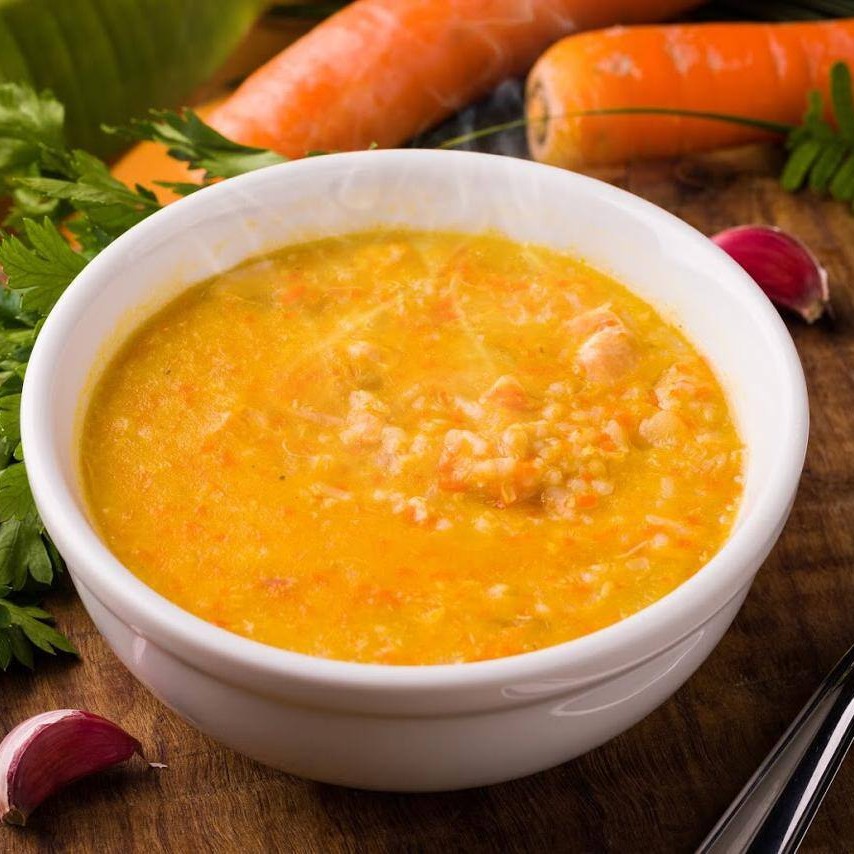 Cenoura, batata, frango, caldo de galinha e arroz integral. Acompanha Muçarela, cheiro verde e torradas