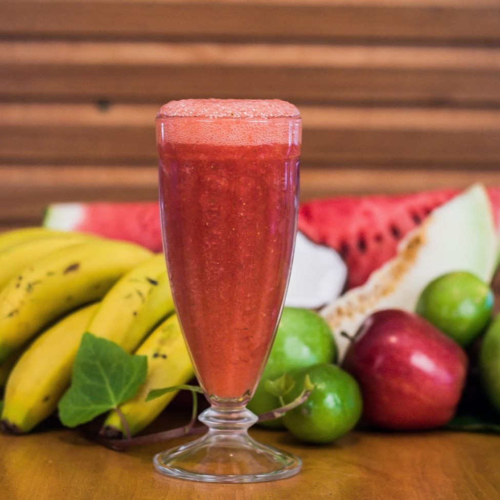 Suco de melancia, morango, mamao, amora e framboesa.