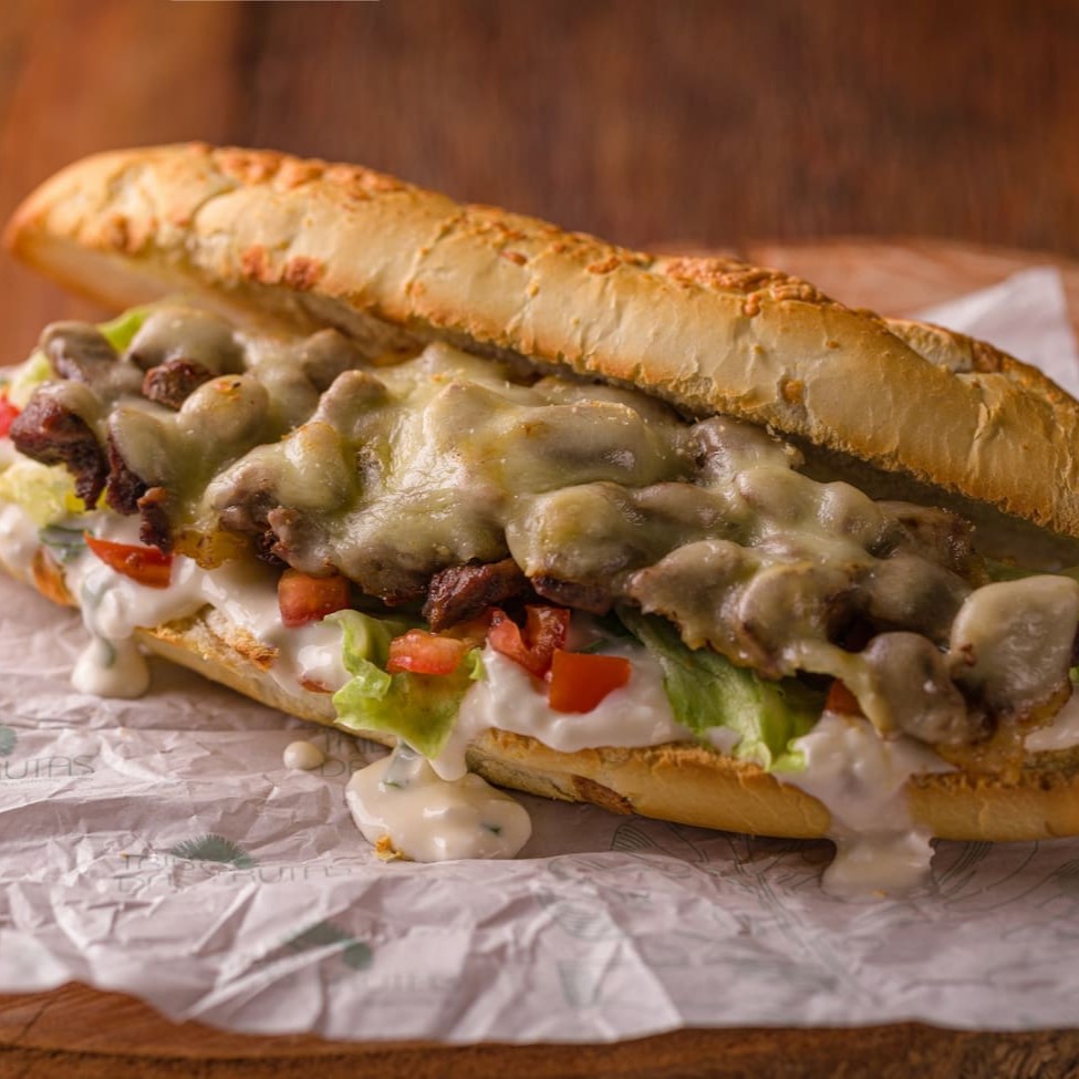 Pão baguete recheado com cubos de mignon ao molho barbecue, que traz um toque defumado, alface americana, queijo mussarela e cebola crispies, criando uma combinação irresistível.