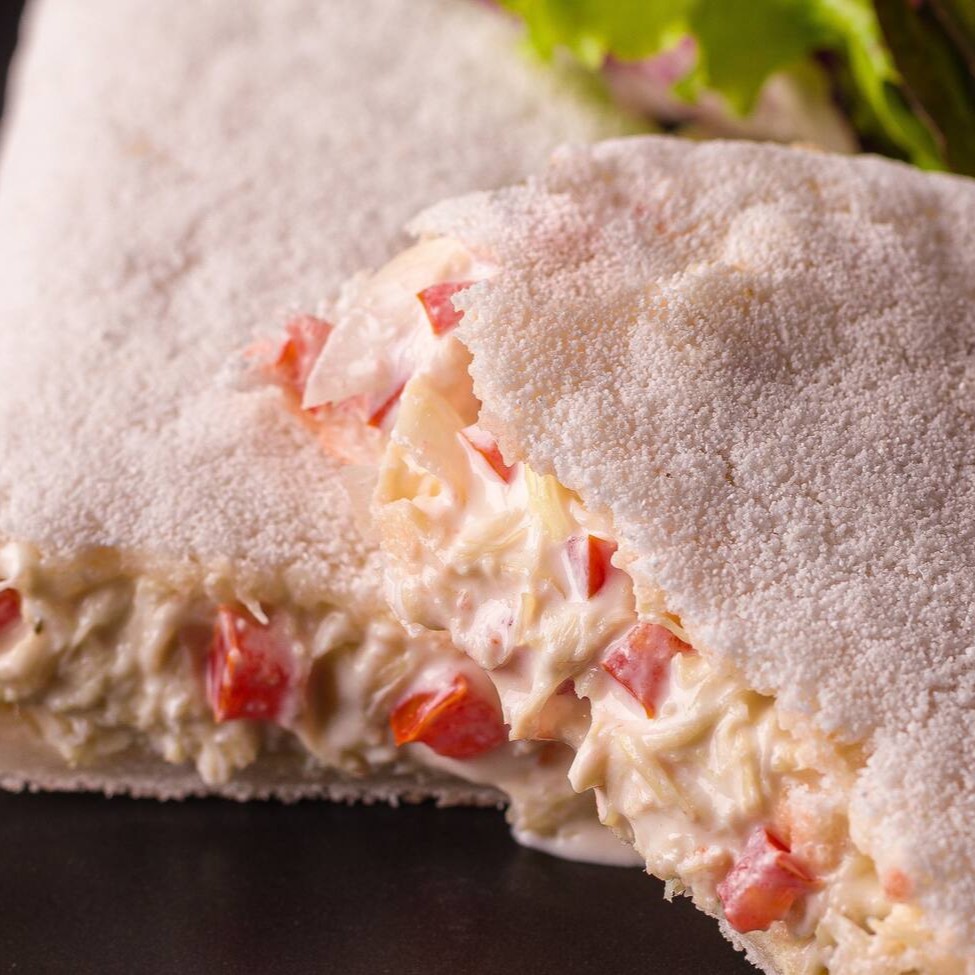 Pão fatiado integral, creme de cottage, pasta de frango desfiado, cenoura, radicchio roxo, alface crespa e batata palha.