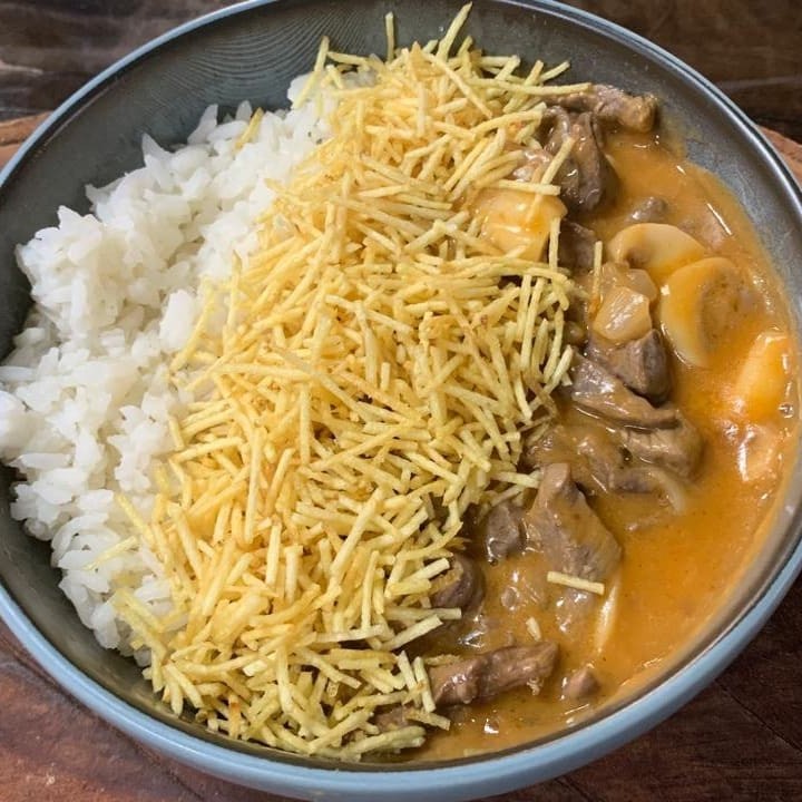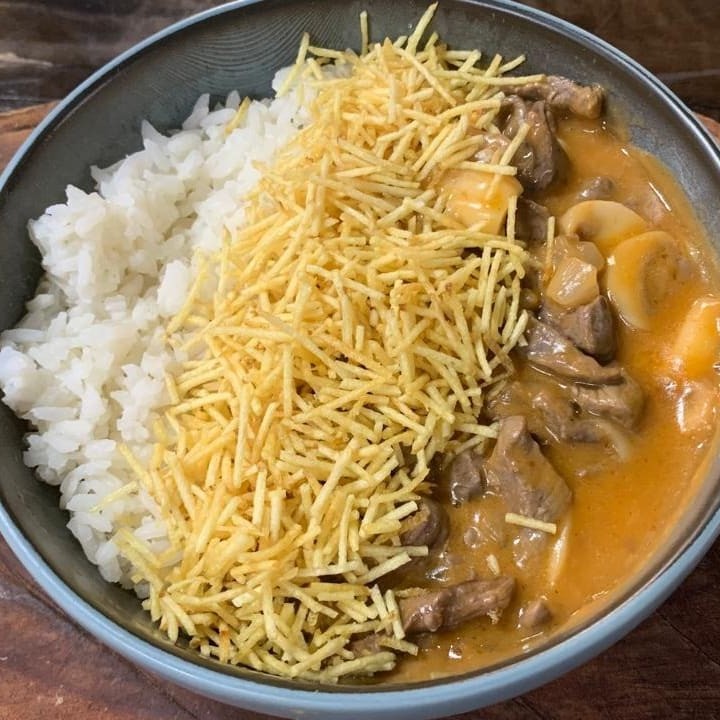 Estrogonofe de frango traz tiras de frango macias e champignons fatiados, envoltos em um molho cremoso e levemente temperado com ketchup e mostarda, servida com arroz branco soltinho e batata palha extrafina, que adiciona um sabor inigualável.