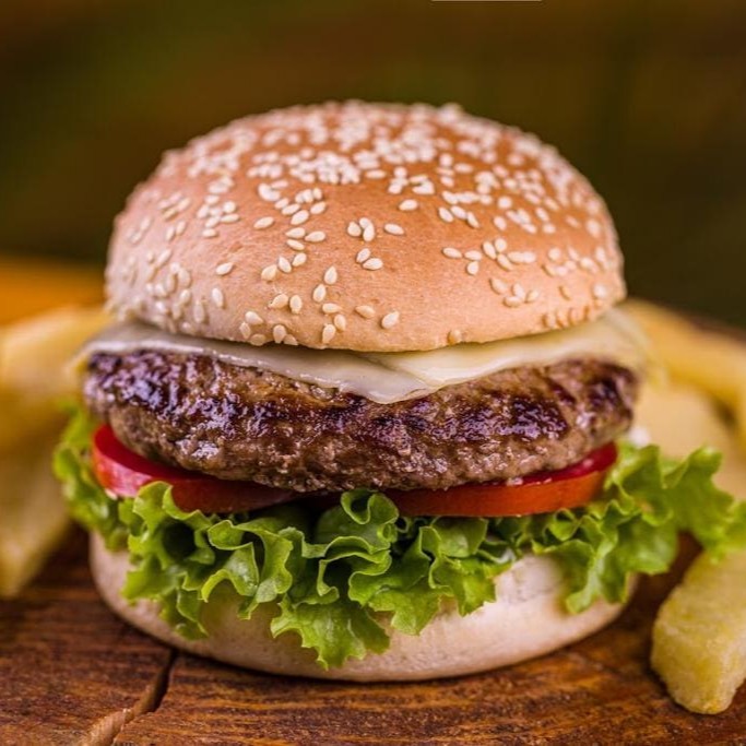 Pão de hamburguer, hamburguer bovino artesanal 130g, maionese, queijo muçarela, alface e tomate. Acompanha batata especial.