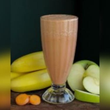 Uma vitamina preparada com maçã verde, banana e cenoura. Essa mistura única de frutas e legumes resulta em uma bebida rica em nutrientes.