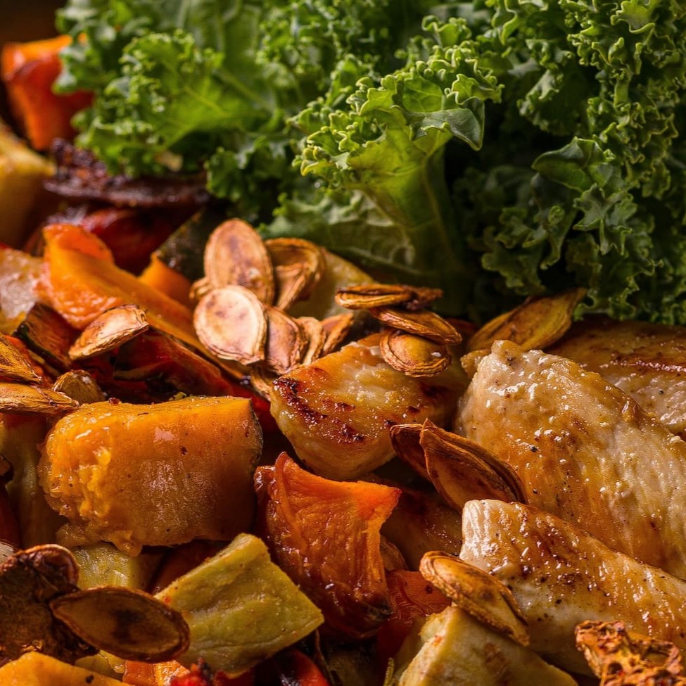 Legumes assados (Abóbora, batata doce, cenoura e cebola ), crunch de sementes,tiras de frango, couve kale, molho de mostarda e mel.