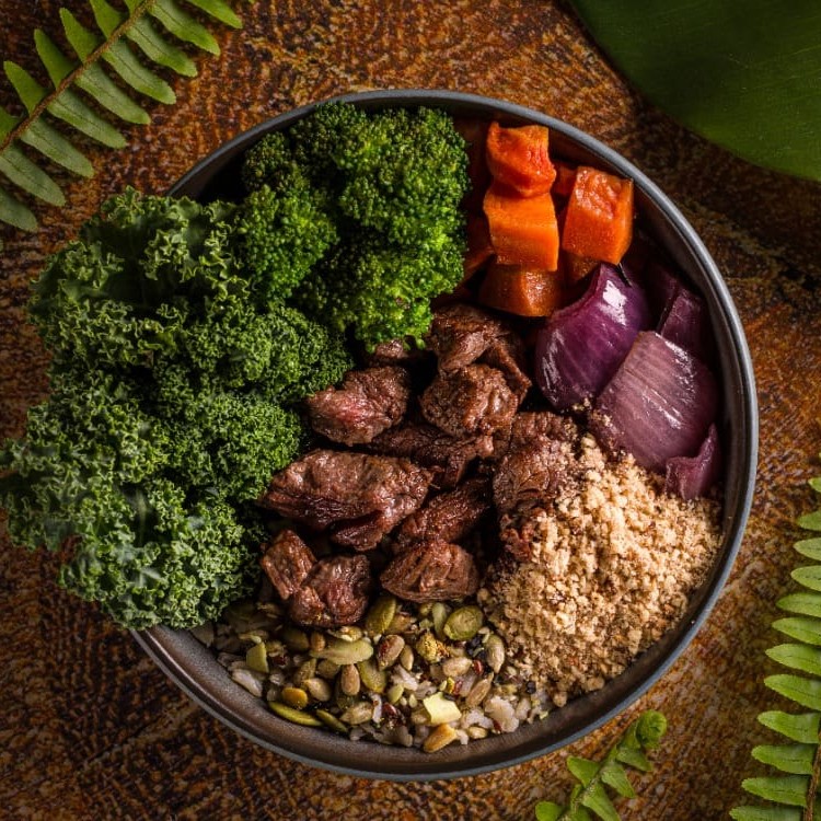 Um bowl saudável e cheio de texturas, que une ingredientes frescos e nutritivos em uma combinação deliciosa. A base é composta por arroz integral com Brócolis, Cenoura, Cebola, farinha de castanha, Mignon cubos, Couve kale fresca completa o bowl, adicionando uma camada extra de crocância e nutrientes.