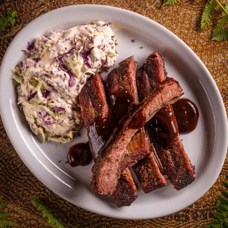 Costelinha suína marinada e assada ao barbecue, Acompanhando essa delícia, uma salada especial de repolho finamente fatiado misturado a um molho que traz frescor e crocância ao prato