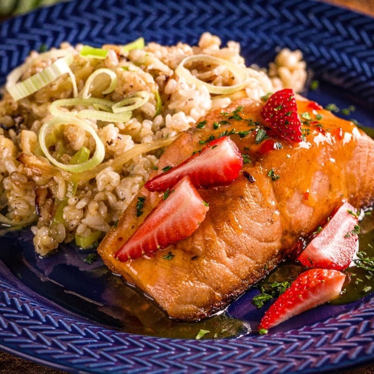 Um prato sofisticado que combina o sabor delicado do salmão(170gr) com um molho inovador de morangos picantes. Acompanha um risoto cremoso de alho-poró, que adiciona uma textura rica. Uma refeição elegante e equilibrada, que une sabores inesperados e técnicas refinadas para uma experiência gastronômica memorável.