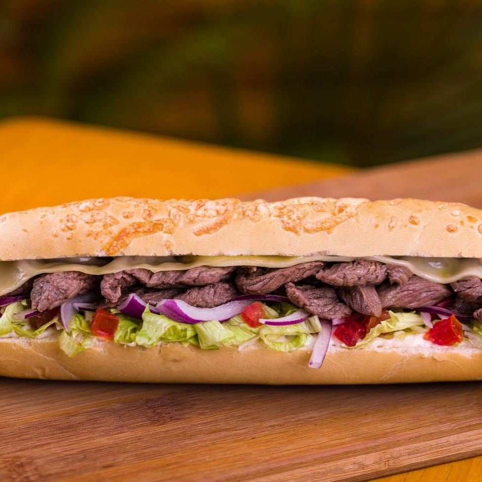 Pão baguete 15 cm, mignon em cubos, alface americana, tomate em cubos, creme cottage e queijo muçarela.
