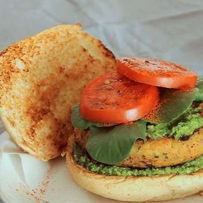Hambúrguer vegetariano de lentilha, servido em um pão de hambúrguer macio, rúcula, tomates cereja, queijo branco e um molho pesto aromático, proporcionando um sabor rico e equilibrado que remete a natureza exuberante. Acompanha batata frita.