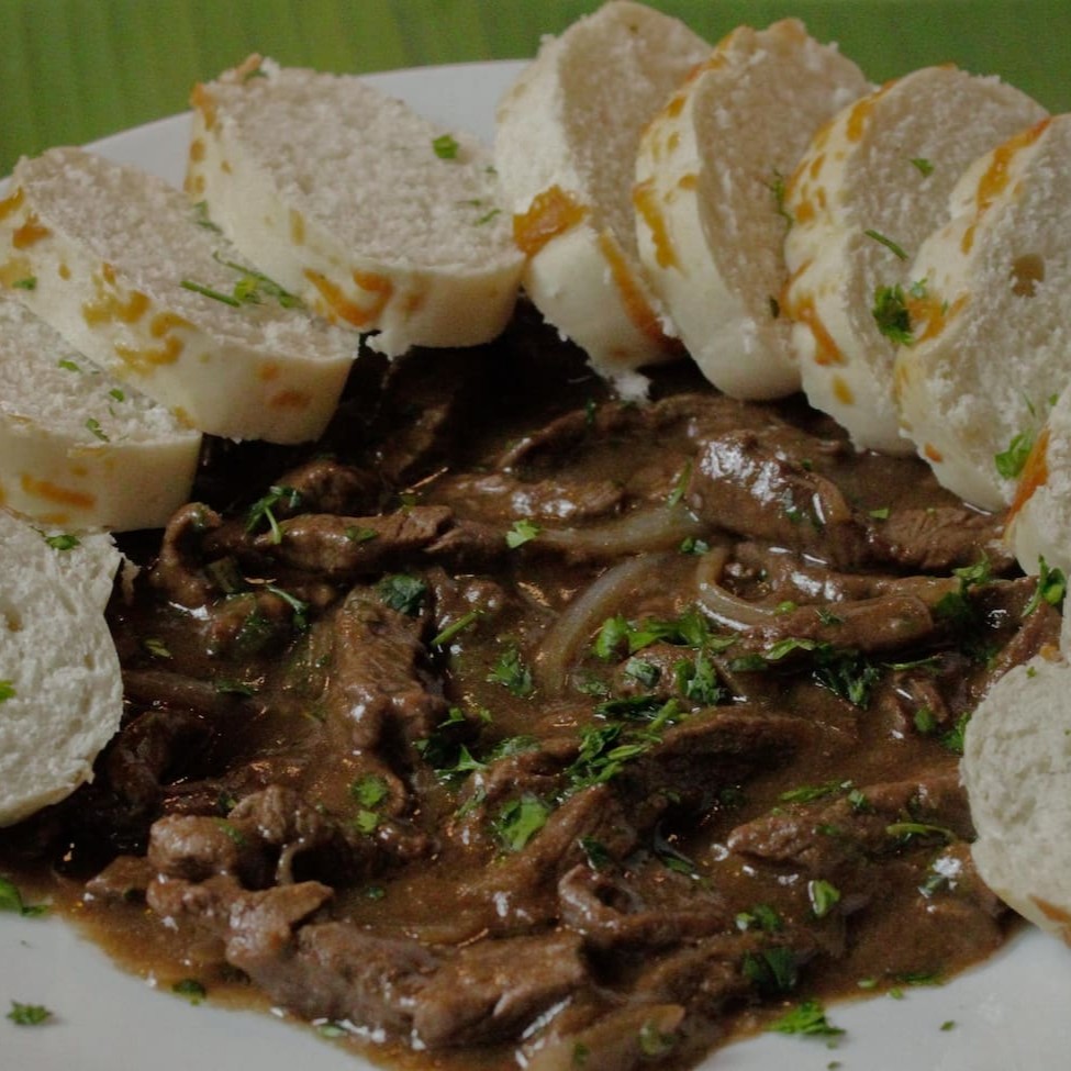 Porção de mignon com sofisticado e aveludado molho madeira, fatias de pão baguete acompanham o prato, perfeito para quem busca uma refeição marcante e cheia de sabor .