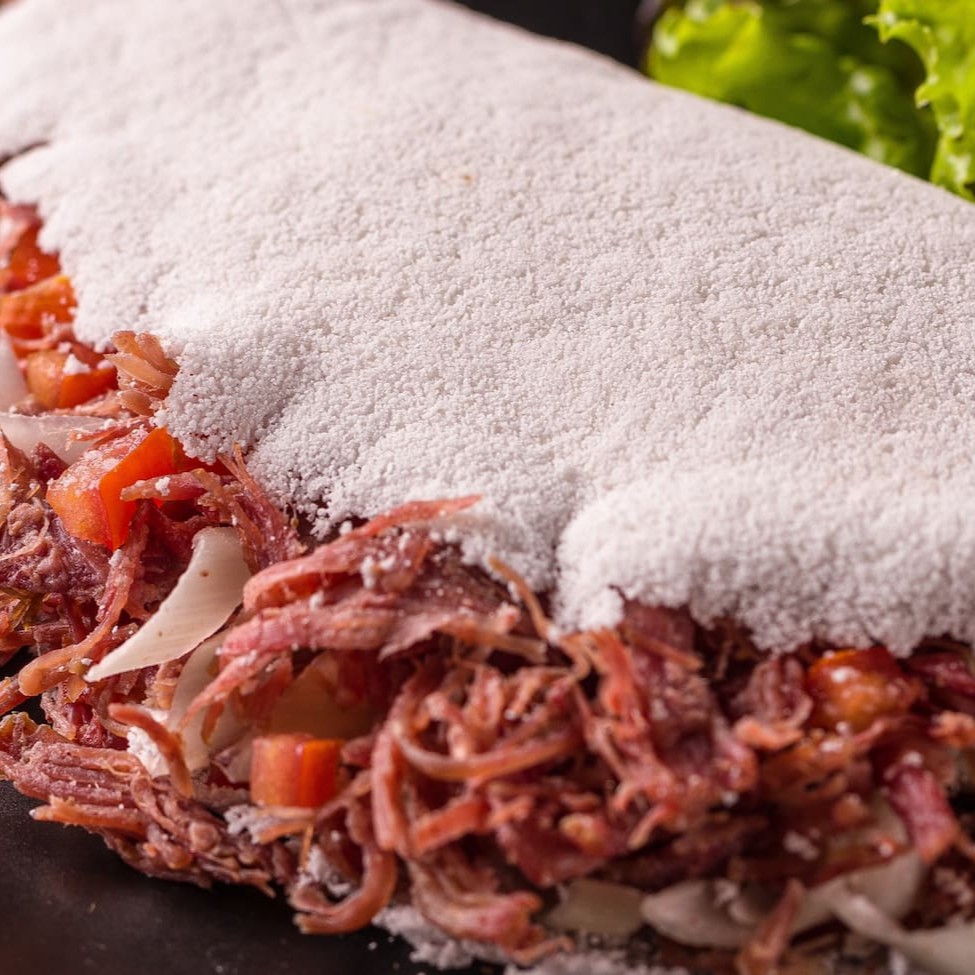 Tapioca recheada com carne seca desfiada, combinada com cubos de tomate e cebola. Um prato típico brasileiro.