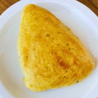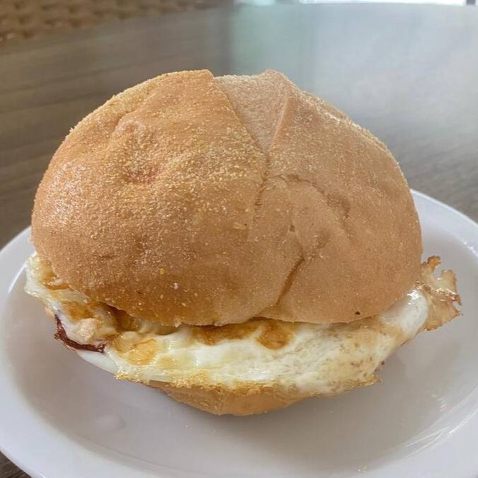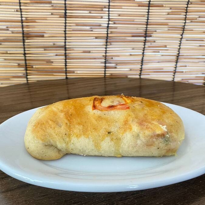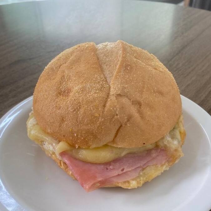 Pão d'água na manteiga, recheado com bolinho de linguiça colonial, erva-doce, mussarela e cream cheese