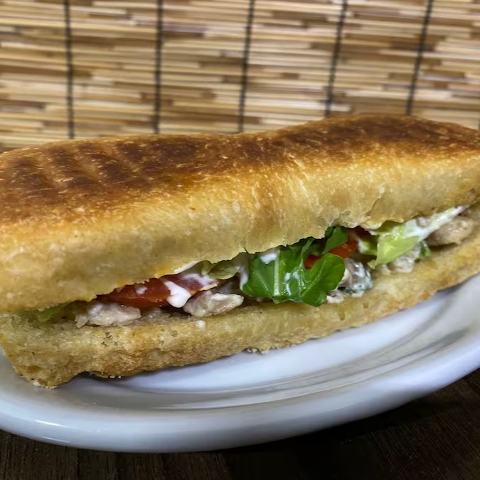 Sanduíche no pão ciabatta de fermentação natural recheado com maionese, frango com cream cheese, rúcula, tomate, picles e alface