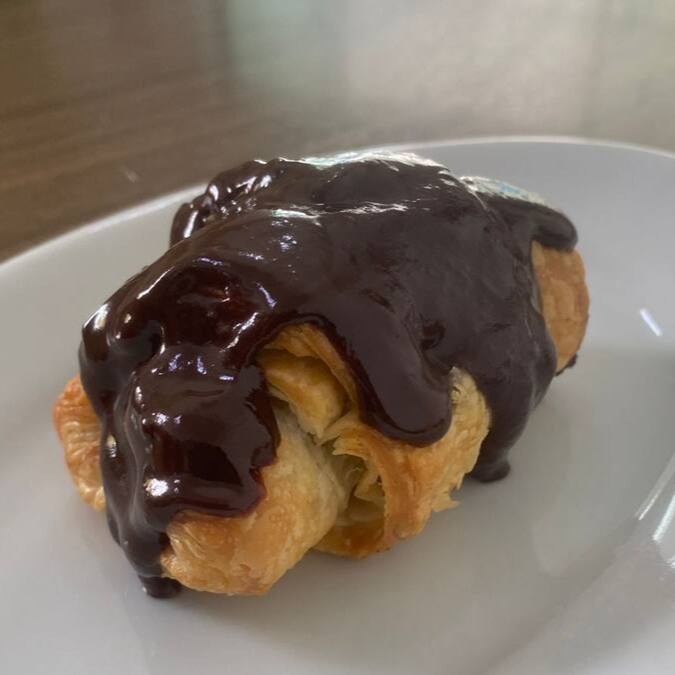 Massa folhada tradicional, com recheio e cobertura de chocolate.