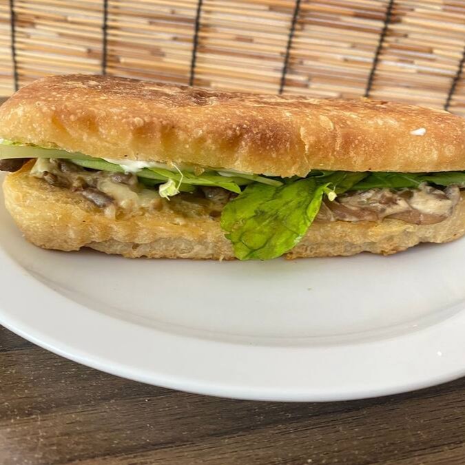 Sanduíche no pão ciabatta de fermentação natural recheado com cogumelos, requeijão vegano, alho poró, rúcula