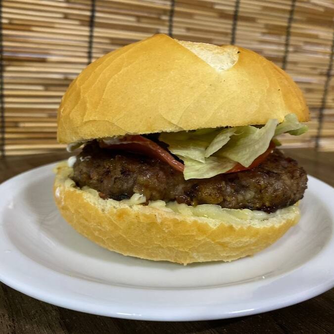 Pão d'água chapado na manteiga, bolinho de carne e temperado, maionese, mussarela, picles, alface e tomate